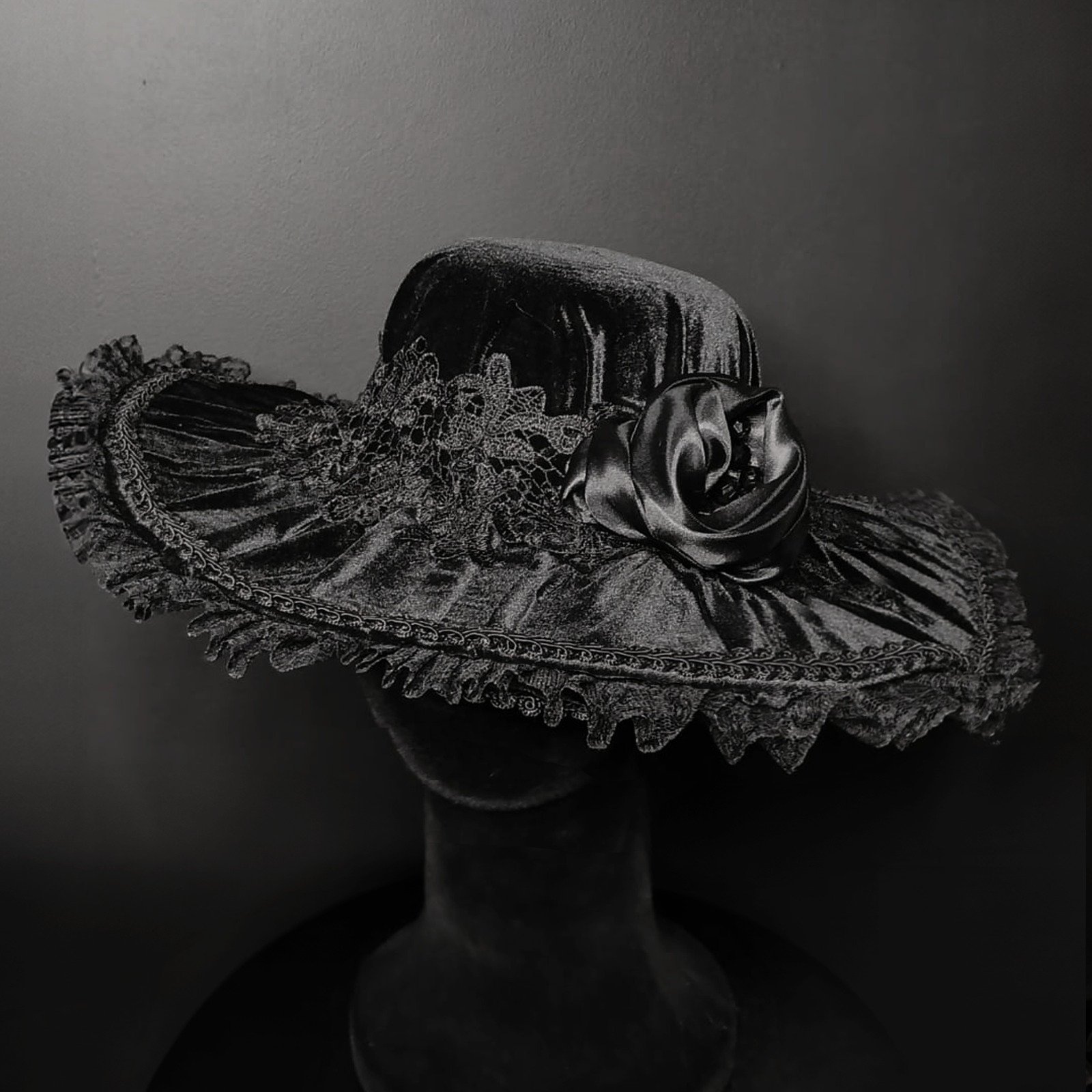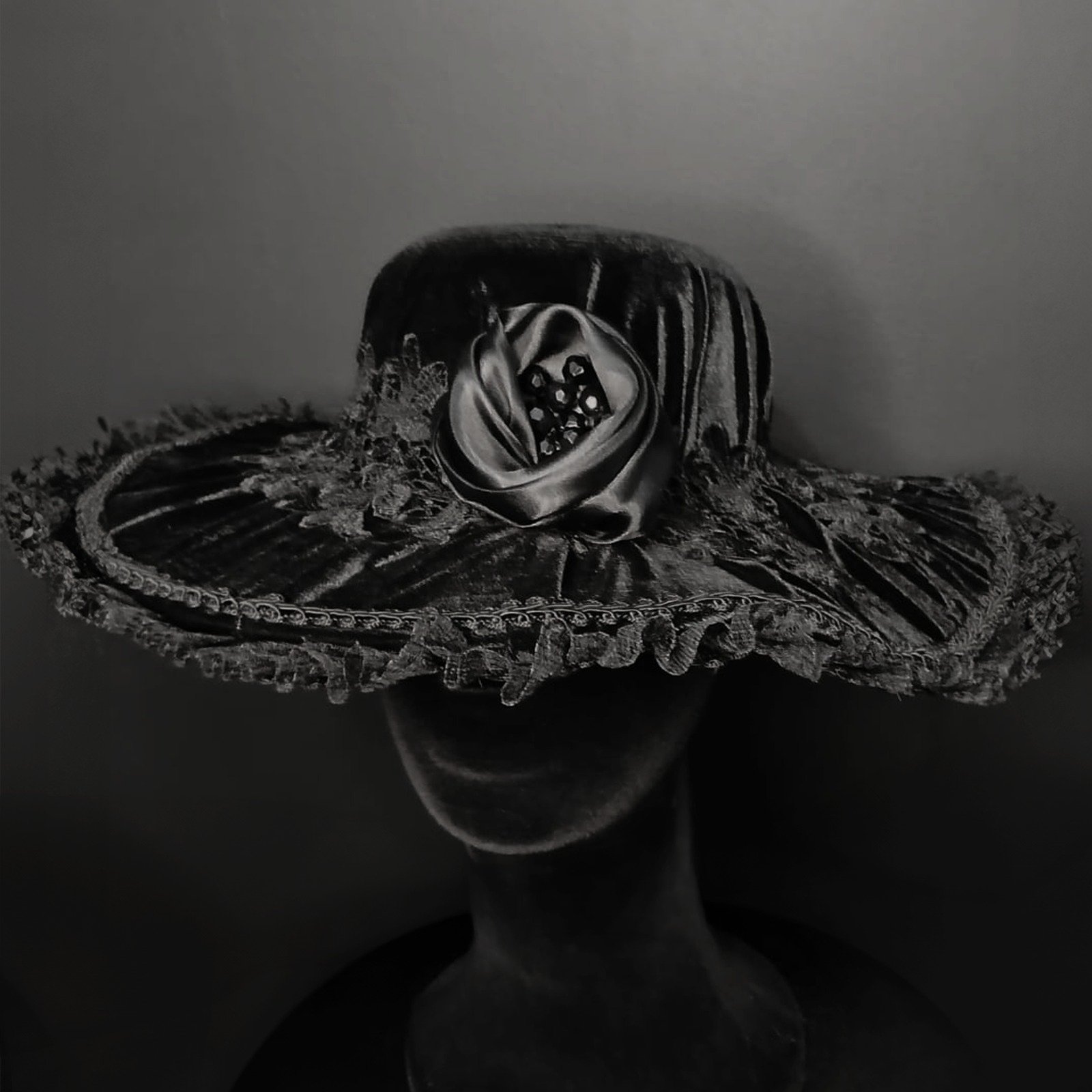 CHAPÉU FORRADO EM VELUDO MOLHADO MACIO, APLIQUES EM RENDA, SIANINHAS E RENDAS FRANZIDAS, FLOR EM CETIM CENTRAL, COM PEDRARIA PRETA NO MIOLO, CIRCUNFERÊNCIA DA CABEÇA 54CM