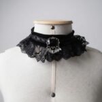 Em até 12x de R$15,98 À vistaR$160,55no Pix colar confeccionado em veludo preto, tule de renda, renda e fita de cetim, com pingente central com pedra negra e morcego, ajustável