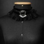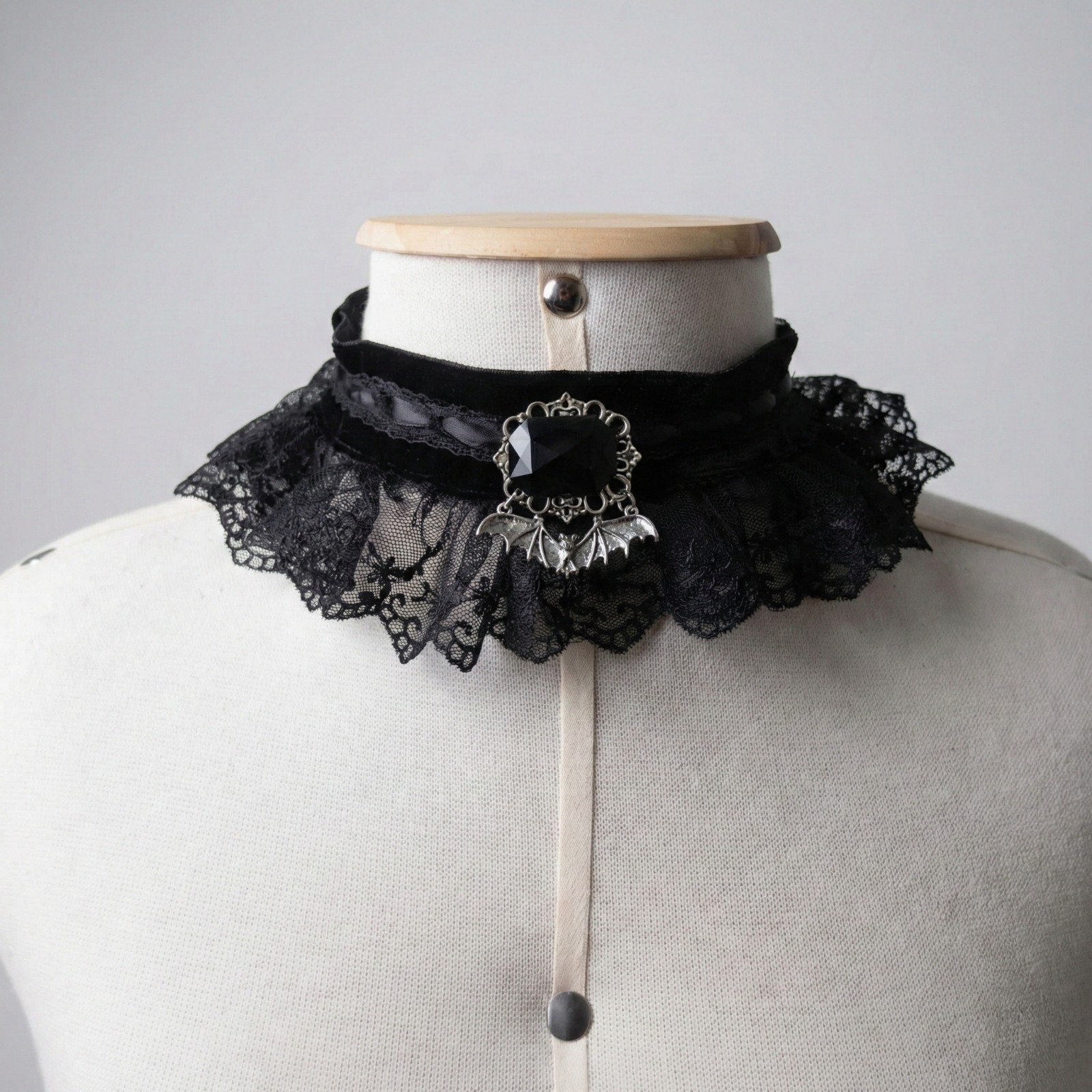 colar confeccionado em veludo preto, tule de renda, renda e fita de cetim, com pingente central com pedra negra e morcego, ajustável