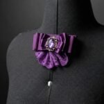 laço roxo confeccionado em fita de cetim e bordado inglês, compeça central metálica e pedra roxa, fechamento de broche.